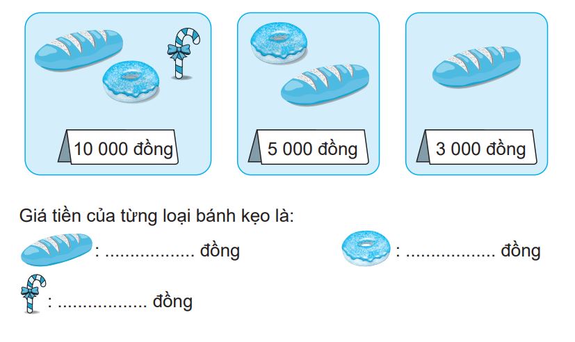 - Bánh mì, bánh ngọt và chiếc kẹo giá 10 000 đồng. Vậy chiếc kẹo có giá là 10 000 đồng – 5 nghìn đồng = 5 000 đồng.