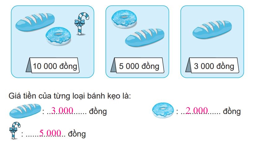 - Bánh mì và bánh ngọt giá 5 000 đồng. Vậy bánh ngọt có giá là 5 000 đồng – 3 000 đồng = 2 000 đồng.