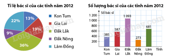 Dũng tính tỉ lệ bác sĩ của các tỉnh so với toàn vùng năm \(2012.\) Sau khi làm tròn số, Dũng dùng biểu đồ hình quạt tròn để biểu diễn dữ liệu. Còn Đức biểu diễn dữ liệu năm 2012 bằng một biểu đồ cột.