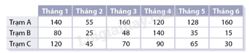 Lượng mưa mỗi tháng giai đoạn \(6\) tháng đầu năm \(2020\) tại ba trạm quan trắc \(A,B,C\) được thống kê trong bảng sau: