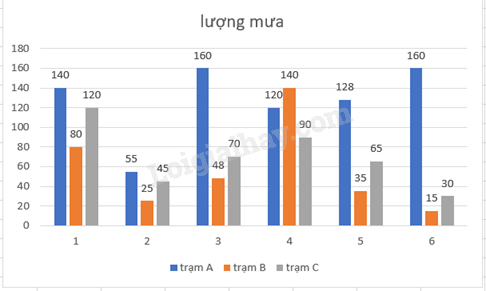 Biểu đồ biểu diễn lượng mưa trong từng tháng ở ba trạm quan trắc.