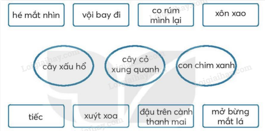 - Từ ngữ chỉ sự vật: cành thanh mai, cây xấu hổ, con chim xanh, cây cỏ, gió