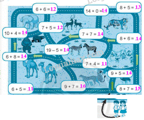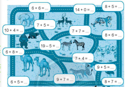 Tính nhẩm kết quả các phép tính trong hình rồi đi theo các kết quả là 14 để đến chuồng voi.