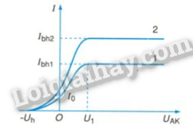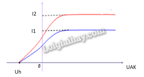 + Khi UAK ≤ -Uh thì dòng quang điện bị triệt tiêu hoàn toàn (I = 0). Sở đĩ như vậy là vì: electron bị bật ra từ cathode, với tốc độ ban đầu vomax và động năng ban đầu Wđmax, chịu tác dụng của lực điện trường hướng về cathode (do Uh gây ra); lực này đã ngăn không cho electron tới anode để gây ra dòng quang điện.