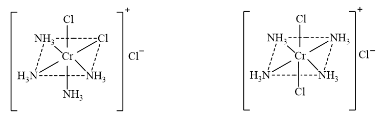 cis - \(\left[ {{\rm{CrC}}{{\rm{l}}_{\rm{2}}}{{\left( {{\rm{N}}{{\rm{H}}_{\rm{3}}}} \right)}_{\rm{4}}}} \right]{\rm{Cl}}\) trans - \(\left[ {{\rm{CrC}}{{\rm{l}}_{\rm{2}}}{{\left( {{\rm{N}}{{\rm{H}}_{\rm{3}}}} \right)}_{\rm{4}}}} \right]{\rm{Cl}}\)