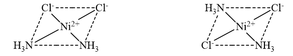 cis - \(\left[ {{\rm{NiC}}{{\rm{l}}_{\rm{2}}}{{\left( {{\rm{N}}{{\rm{H}}_{\rm{3}}}} \right)}_{\rm{2}}}} \right]\) trans - \(\left[ {{\rm{NiC}}{{\rm{l}}_{\rm{2}}}{{\left( {{\rm{N}}{{\rm{H}}_{\rm{3}}}} \right)}_{\rm{2}}}} \right]\)