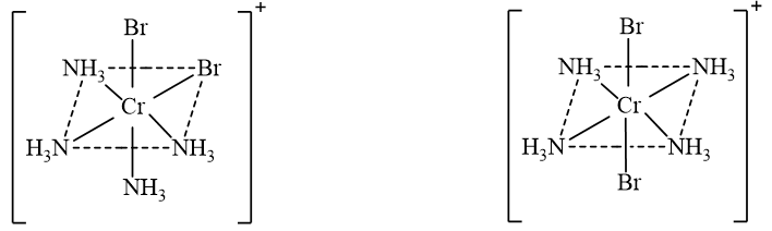 cis - \({\left[ {{\rm{Cr}}{{\left( {{\rm{N}}{{\rm{H}}_{\rm{3}}}} \right)}_4}{\rm{B}}{{\rm{r}}_{\rm{2}}}} \right]^ + }\) trans - \({\left[ {{\rm{Cr}}{{\left( {{\rm{N}}{{\rm{H}}_{\rm{3}}}} \right)}_4}{\rm{B}}{{\rm{r}}_{\rm{2}}}} \right]^ + }\)