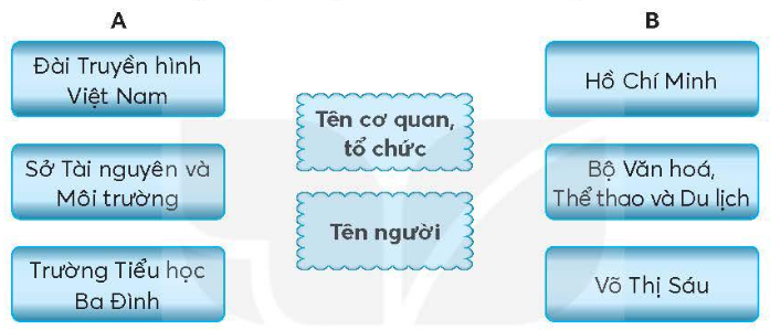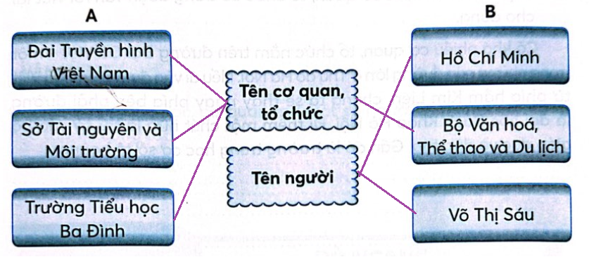 Nối các từ ngữ ở cột A, cột B với nhóm thích hợp. Cách viết hoa tên của các cơ quan, tổ chức có gì khác với cách viết hoa tên người. Tách tên cơ quan, tổ chức dưới đây thành các bộ phận và nhận xét về cách viết hoa các bộ phận trong tên cơ quan, tổ chức. Viết tên cơ quan, tổ chức theo 2 nhóm. Gạch dưới tên các cơ quan, tổ chức có trong đoạn văn rồi viết lại cho đúng. Viết báo cáo thảo luận nhóm về một trong các chủ đề dưới đây. Ghi lại tên trường học, cơ quan mà một số người thân của em đang học