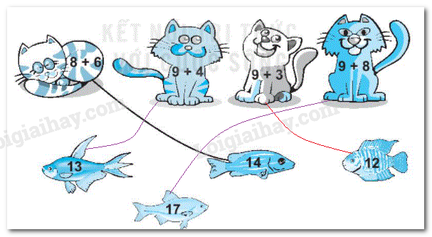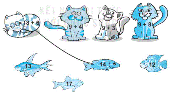 Tính nhẩm kết quả phép tính ghi trên mỗi con mèo rồi nối với số ghi trên con cá cho thích hợp.