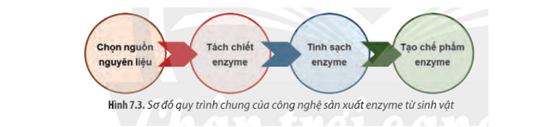 1. Chọn nguồn nguyên liệu -> 2. Tách chiết enzyme -> 3. Tinh sạch enzyme -> 4. Tạo chế phẩm enzyme.