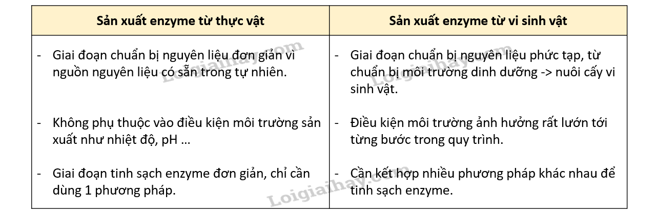b) Việc sản xuất enzyme từ thực vật có gì giống và khác so với sản xuất enzyme từ vi sinh vật.