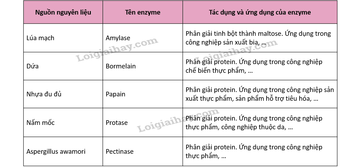 Hoàn thành bảng sau đây về nguồn thu nhận, tác dụng và ứng dụng của một số loại enzyme.