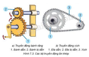 Quan sát Hình 7.3 và mô tả cấu tạo của truyền động bánh răng; truyền động xích.