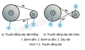 Quan sát Hình 7.2 và so sánh chiều quay của bánh dẫn và bánh bị dẫn trong hai trường hợp truyền động dây đai thẳng và truyền động dây đai chéo.