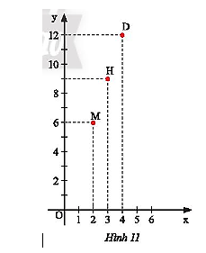 Số quyển vở (x) đã mua và số tiền (y) (nghìn đồng) phải trả của ba bạn Hùng, Dũng, Mạnh được biểu diễn lần lượt bởi ba điểm (H,D,M) trong mặt phẳng tọa độ (Oxy) như Hình 11.