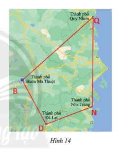 Trên bản đồ, tứ giác \(BDNQ\) với các đỉnh là các thành phố Buôn Ma Thuột, Đà Lạt, Nha Trang, Quy Nhơn.