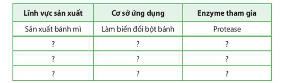 1. Hãy liên hệ những lĩnh vực sản xuất và đời sống có ứng dụng các loại enzyme bằng cách hoàn thành vào bảng theo mẫu sau:
