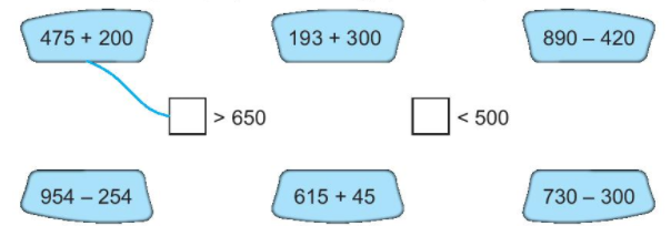 - Nối những phép tính có kết quả lớn hơn 650 và nhỏ hơn 500 cho thích hợp.