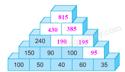 Quan sát hình vẽ ta nhận thấy quy luật: Tổng hai số hàng dưới bằng số hàng trên. Từ đó ta điền được các số còn thiếu.