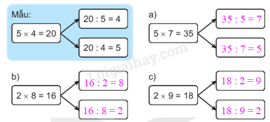 Quan sát ví dụ mẫu, từ phép nhân ta viết thành hai phép chia tương ứng.