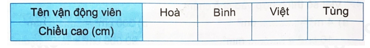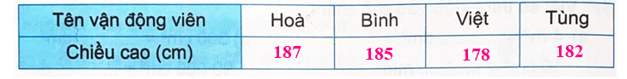 Cho biết chiều cao của bốn vận động viên Tùng, Hòa, Việt, Bình theo thứ tự là: 182 cm, 187 cm, 178 cm, 185 cm.