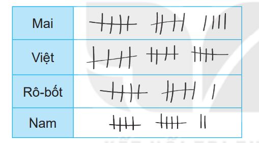 Mai: 14 câu; Việt: 15 câu; Rô-bốt: 11 câu; Nam: 12 câu.