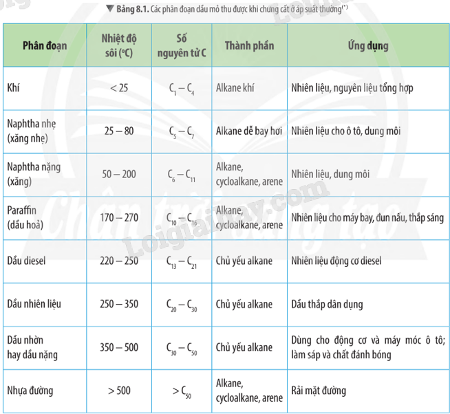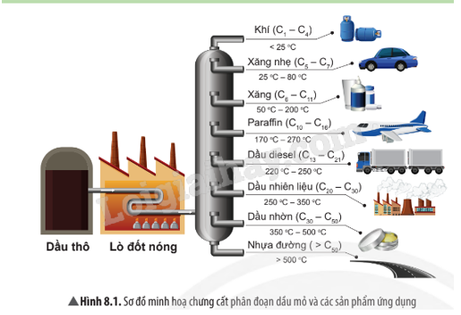 Dựa vào hình 8.1 hãy mô tả quá trình chưng cất phân đoạn dầu mỏ và các sản phẩm ứng dụng