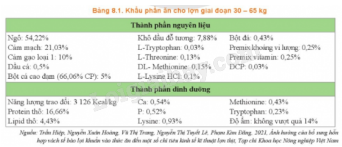 - Từ bảng 8.1, ta thấy ngô, cám mạch, cám gạo là thành phần đáp ứng nhu cầu năng lượng.