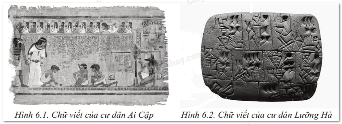 Hình 6.1 là chữ viết của cư dân Ai Cập trên giấy làm từ thân cây Pa-pi-rút. Còn hình 6.2 là chữ của cư dân Lưỡng Hà viết trên đất sét. Chữ của Lưỡng Hà và Ai Cập đều là chữ tượng hình.