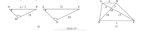a) Trong Hình 20a, cho biết \(\widehat N = \widehat E,\widehat M = \widehat D,MP = 18m,DF = 24m,\)\(EF = 32m,\)\(NP = a + 3\left( m \right)\). Tìm \(a\).