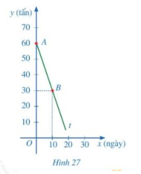b) Trong hình 27, tia At là một phần đường thẳng y = ax + b. Tìm a, b. Từ đó hãy cho biết trong kho còn lại bao nhiêu tấn xi măng sau 15 ngày.