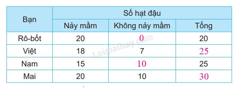 Các bạn Rô-bốt, Việt, Nam và Mai đã gieo một số hạt đậu để quan sát sự nảy mầm của hạt. Số liệu về số hạt đậu nảy mầm và không nảy mầm của mỗi bạn được ghi lại trong bảng sau: