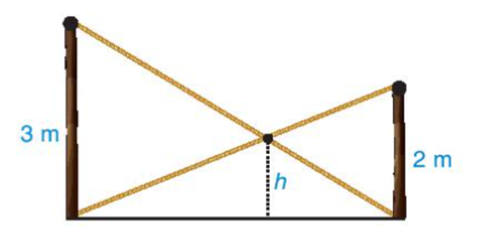 Có hai chiếc cột dựng thẳng đứng trên mặt đất với chiều cao lần lượt là 3m và 2m. Người ta nối hai sợi dây từ đỉnh cột này đến chân cột kia và hai sợi dây cắt nhau tại một điểm (H.9.25), hãy tính độ cao h của điểm đó so với mặt đất.