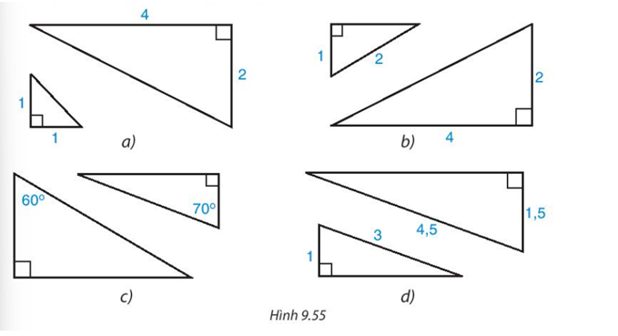 Cặp tam giác vuông nào đồng dạng với nhau trong hình 9.55