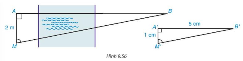 Một người ở vị trí điểm A muốn đo khoảng cách đến điểm B ở bên kia sông mà không thể qua sông được. Sử dụng giác kế, người đó xác định được một điểm M trên bờ sông sao cho AM = 2 m, AM vuông góc với AB và đo được số đo góc AMB. Tiếp theo, người đó vẽ trên giấy tam giác A'M'B' vuông tại A' có AM' = 1cm, \(\widehat {A'M'B'} = \widehat {AMB}\) và đo được A'B' = 5 cm (H.9.56). Hỏi khoảng cách từ A đến B là bao nhiêu mét?