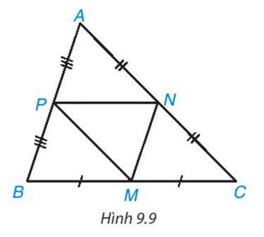 Trong hình 9.9, ABC là tam giác không cân; M, N, P lần lượt là trung điểm của BC, CA, AB. Hãy tìm trong hình năm tam giác khác nhau mà chúng đôi một đồng dạng với nhau. Giải thích vì sao chúng đồng dạng