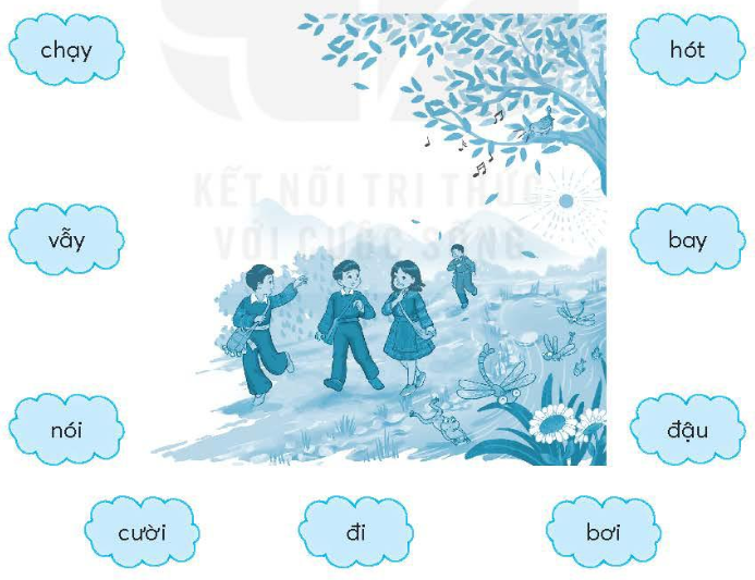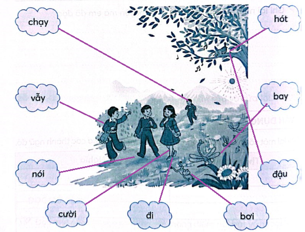 Quan sát tranh, nối từ chỉ hoạt động thích hợp với người và vật trong tranh.