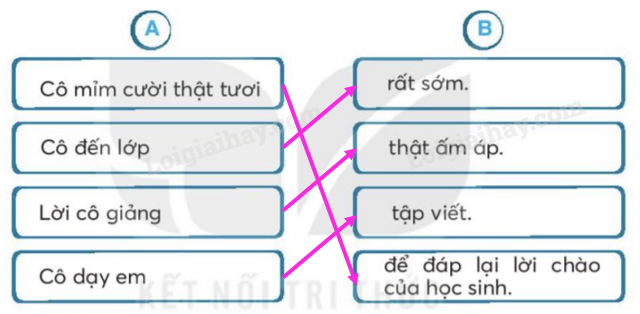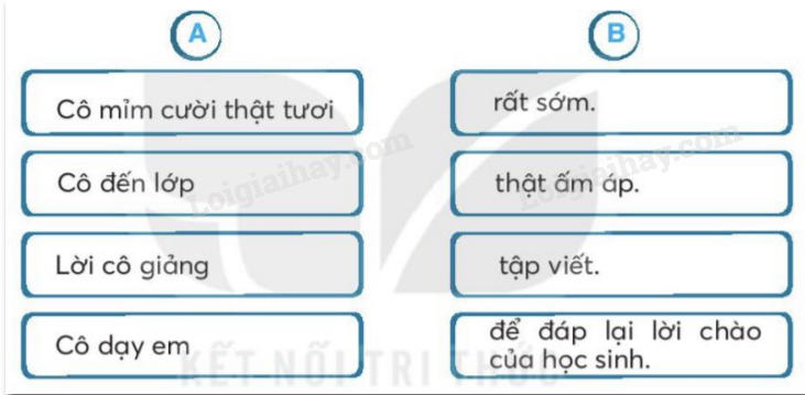 Nối từ ngữ ở cột A với từ ngữ ở cột B để tạo câu nói về cô giáo trong bài đọc.
