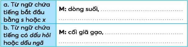 a. Từ ngữ chứa tiếng bắt đầu bằng s hoặc x: dòng suối, xe máy, cây xanh, cái xẻng, con sóc, nhà sàn, xô nước,...