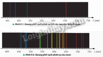 Quan sát Hình 9.1 và 9.6, so sánh quang phổ vạch phát xạ của nguyên tử hydrogen và neon về số lượng vạch.