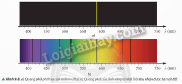 Quan sát quang phổ vạch phát xạ của nguyên tử hydrogen (H) (Hình 9.7a), quang phổ vạch phát xạ của nguyên tử sodium (Na) (Hình 9.8a) và quang phổ của ánh sáng mặt trời thu nhận được từ mặt đất (Hình 9.8b). Giải thích sự xuất hiện các vạch tối trên nền màu liên tục trong Hình 9.8b. Vì sao từ các vạch tối này, ta có thể khẳng định trong khí quyển quanh Trái Đất có tồn tại nguyên tử hydrogen (H) và nguyên tử sodium (Na).