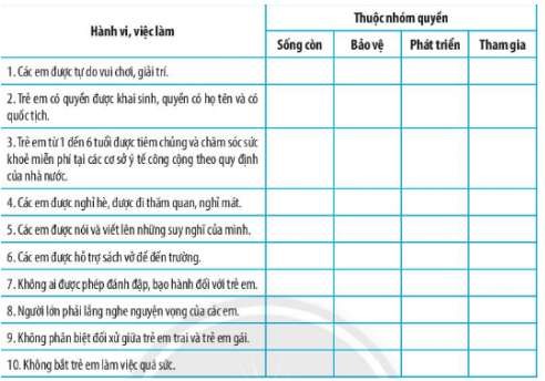 Học sinh đọc các hành vi, việc làm và đánh dấu X vào các nhóm quyền tương ứng (quyền sống còn, quyền bảo vệ, quyền phát triển, quyền tham gia)