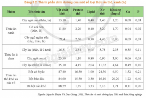 Hãy nêu thành phần dinh dưỡng và vai trò của một số thức ăn thô, xanh trong Bảng 9.2