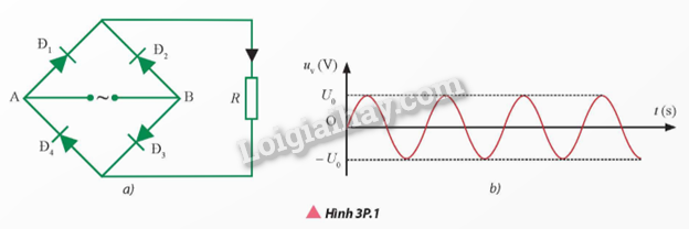 Một bạn học sinh dự định lắp một mạch điện chỉnh lưu cả chu kì sử dụng cầu chỉnh lưu, nhưng do sơ suất nên mắc nhầm cực của diode Đ3 (Hình 3P.1a). Đặt vào hai đầu A, B một điện áp xoay chiều có dạng như Hình 3P.1b. Hỏi ở đầu ra trên điện trở R có tạo được điện áp chỉnh lưu cả chu kì như Hình 3.11b không? Hãy vẽ hình dạng đồ thị điện áp ra trên điện trở R khi đó.