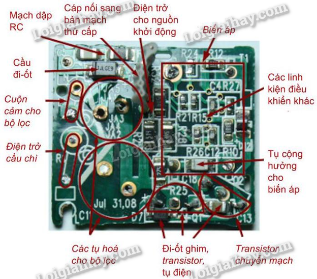 Trong hình ảnh trên ta thấy có diode bán dẫn. Diode bán dẫn là một loại linh kiện bán dẫn chỉ cho phép dòng điện đi qua nó theo một chiều nhất định. Chính hệ thống này trong bộ sạc sẽ chuyển đổi dòng điện xoay chiều thành dòng điện một chiều. Và có thêm tụ điện lọc trong bộ sạc sẽ giúp dòng điện có điện áp ổn định và phù hợp với nhu cầu sạc pin điện thoại.