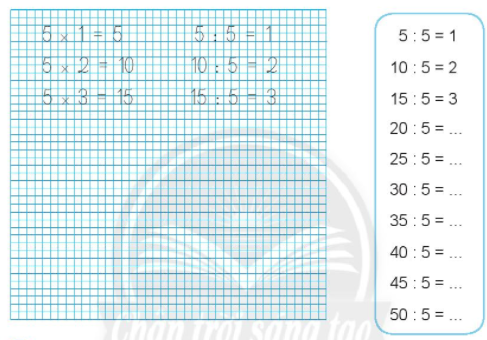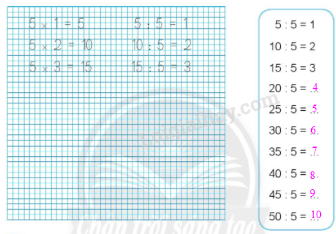 Dựa vào bảng nhân 5, tìm kết quả bảng chia 5 (viết theo mẫu).
