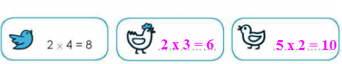 - Đếm số con gà trong mỗi nhóm và số nhóm rồi viết phép nhân tương ứng.