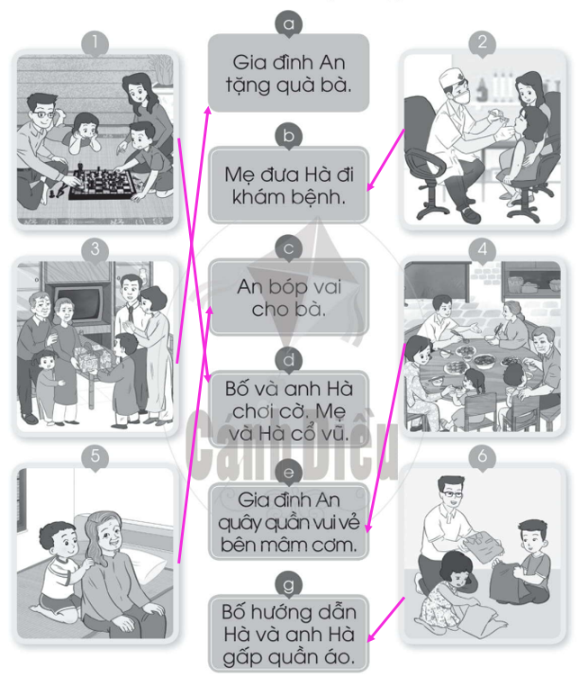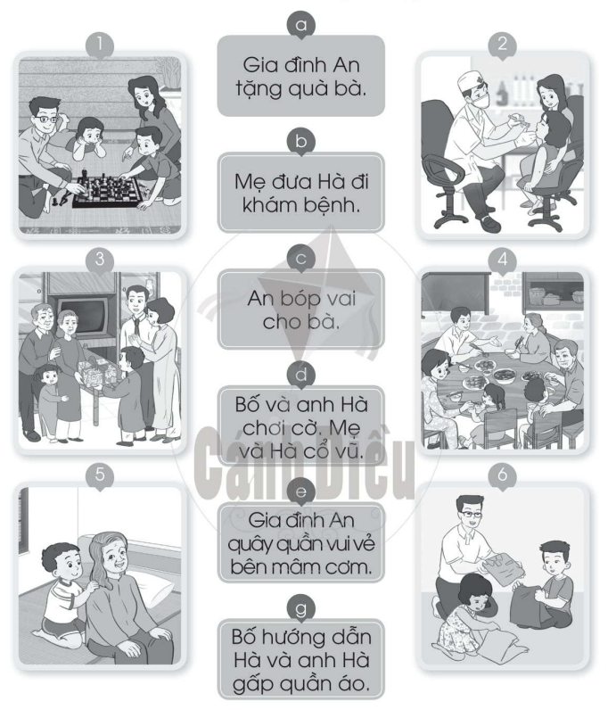 Viết các thành viên của mỗi thế hệ trong gia đình bạn Hà, gia đình bạn An vào bảng dưới đây. Gia đình em có mấy thế hệ cùng chung sống. Viết, vẽ sơ đồ các thế hệ trong gia đình em vào khung dưới đây. Nối hình với ô chữ cho phù hợp. Nói về sự chia sẻ, quan tâm, chăm sóc, yêu thương của em đối với các thành viên trong gia đình cho các bạn nghe.
