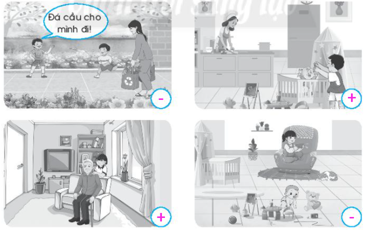 Viết dấu + vào hình tròn ở hình chỉ hành động em đồng tình, viết dấu – vào hình tròn chỉ hành động em không đồng tình.