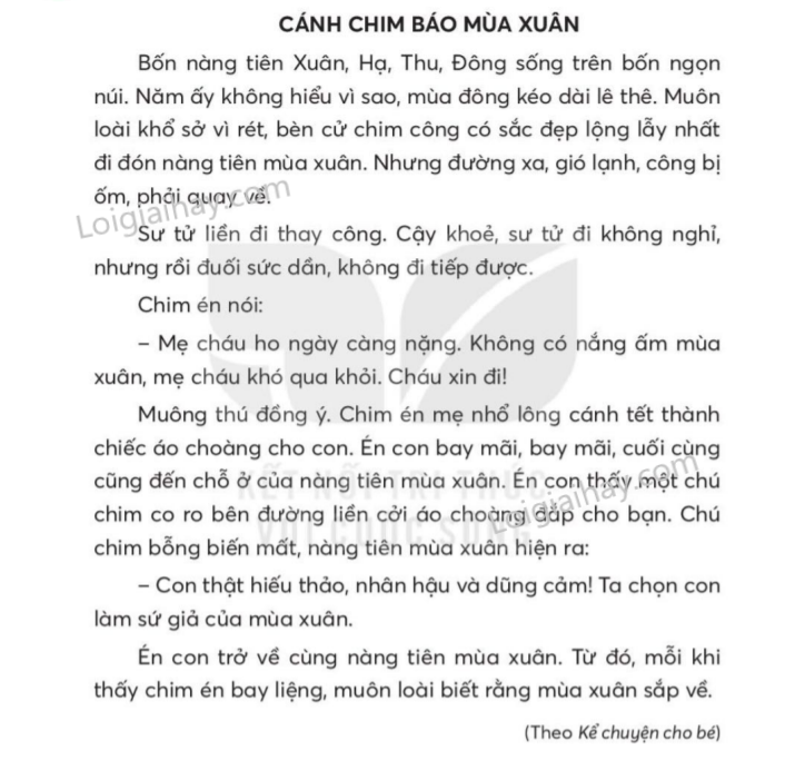 g. Chim én được nàng tiên mùa xuân chọn làm sứ giả của mùa xuân vì chim én có lòng hiếu thảo, nhân hậu và dũng cảm.